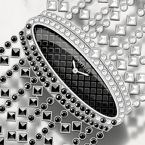Baignoire Étoilée is a jewellery luxury replica watch with an exquisite bracelet. The bracelet is composed of small round and square-cut gemstones randomly set in a hollow link structure. On the dial of the east-west oval case, the gem’s inverted square shape recurs, with two rows of white diamonds on the top and two rows of black spinels on the bottom. The 18k white gold bracelet is set with diamonds and black spinel. The movement is a quartz movement.
